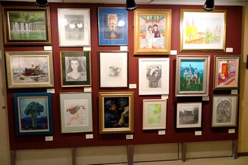 油彩、水彩、パステル、デッサン、日本画、絵付け、陶芸などの作品が会場を埋め尽くすように並べられました。