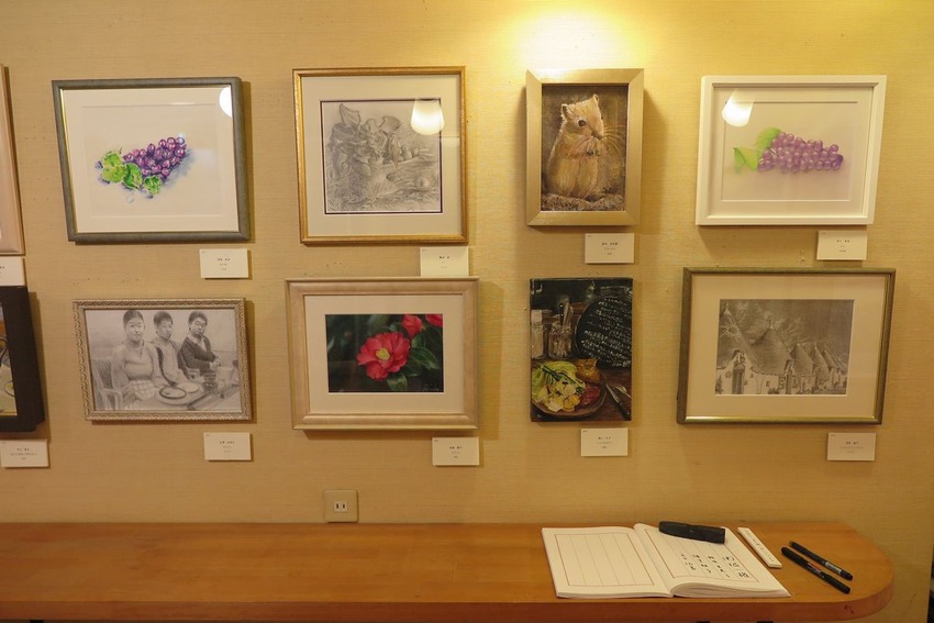 昨年から増設した壁面もフル活用。壁面の隙間は皆無の状態となりました。こちらは水彩、デッサン、パステル、色鉛筆など紙に描いた作品が中心に展示されていました。デッサン作品の中には息を呑む密度の作品もありました。