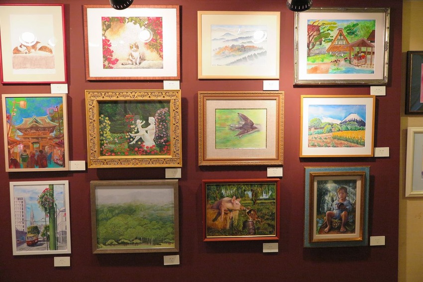 油彩、水彩、パステル、デッサン、日本画、絵付け、陶芸などの作品が会場を埋め尽くすように並べられました。