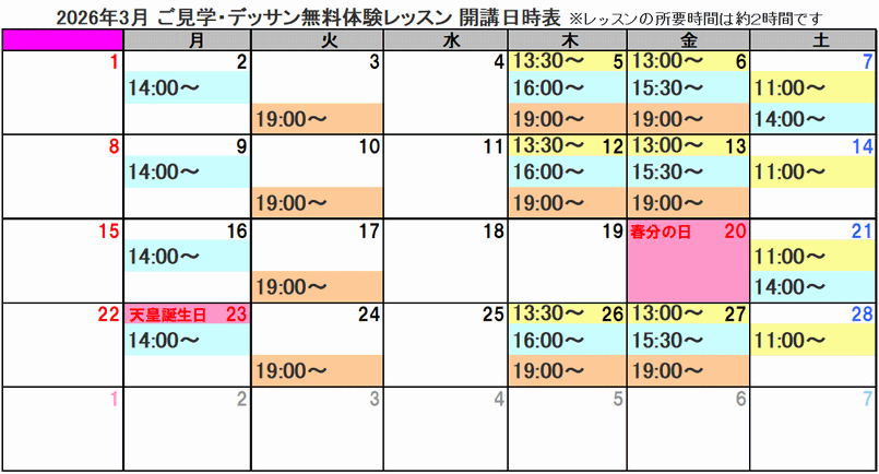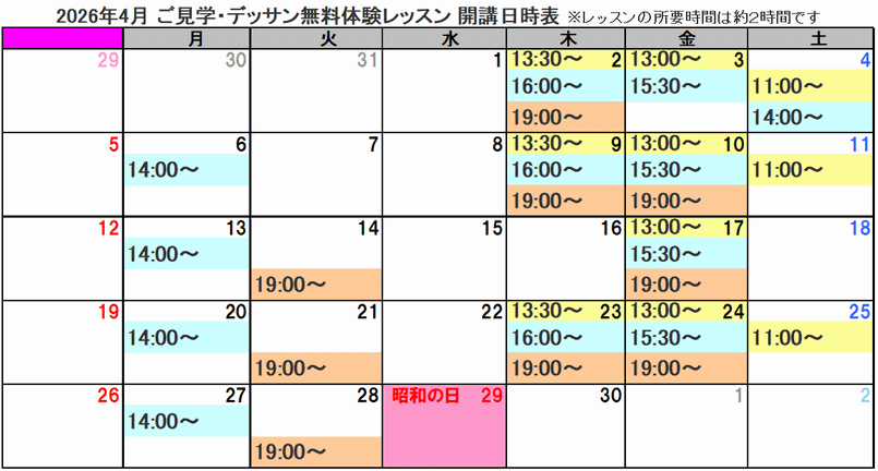 見学や体験レッスンは授業が行われている時間帯のご来校をお勧めしております。下の表からご都合の良い日時枠をご検討下さいませ。なお御予約はご希望する日の前日までご連絡下さい。