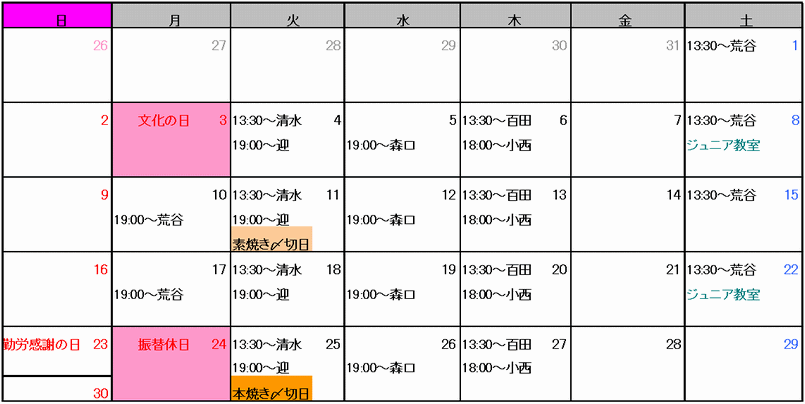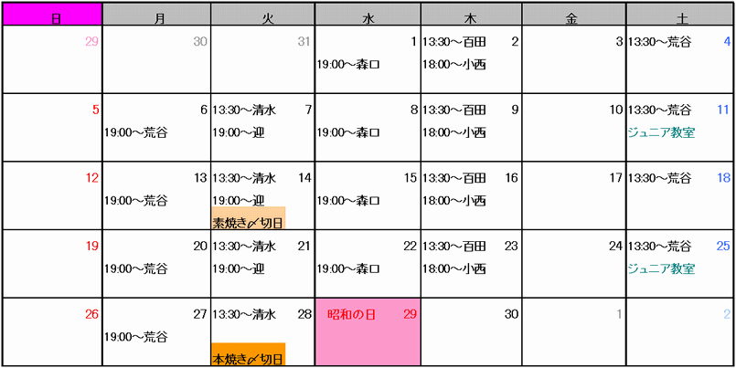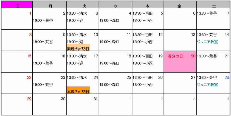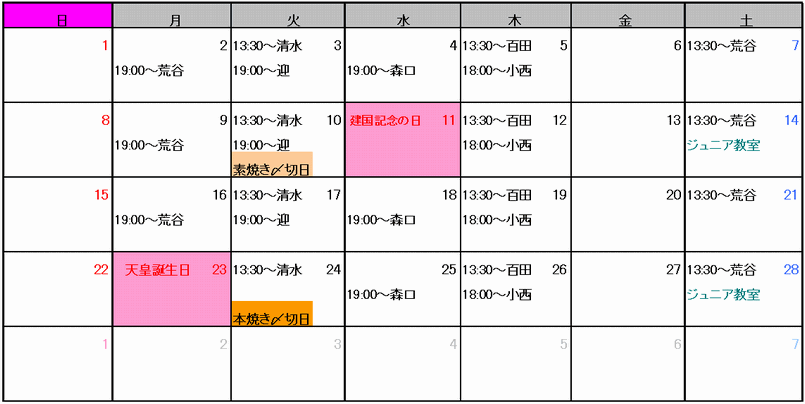 ご予約は、スクールの予約表にご記入頂くか、お電話又はメールでも受け付けています。