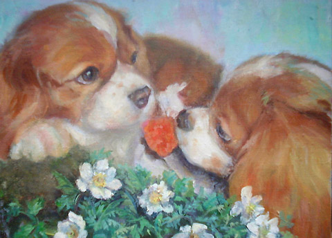 『2匹の犬の愛くるしい表情が大変かわいらしく表現されています。色彩も、パステル調の色味を背景にもってくるなど、全体に明るい印象を受け、絵のテーマとマッチしています。 手前に花を組み合わせた事もより絵としての魅力を高めています。』