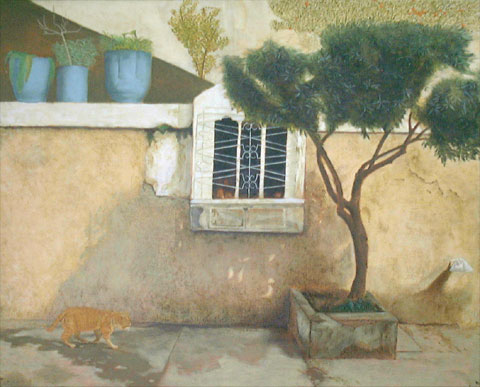 『米国の具象作家アンドリューワイエスの制作プロセスを参考に描きました。特に秀逸なのは壁面の質感で、ドライブラシ技法を駆使した見事な表現になりました。中央の白い柵をしっかりシンメトリーに描き、本人の几帳面さが表れていて好感が持てます。長期に渡る制作でしたが仕事で疲れている中でも午前中からしっかり受講しねばり強く描き切りました。』