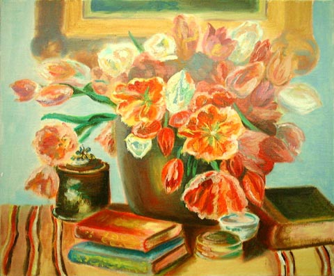 とても花の生命感にあふれた作品に仕上がっています。 色も多彩で表面的な描写に終るのではなく、作者が心で感じた色や、花の生命力などが描き出されています。また、絵の具ののせ方にも変化があり、花から力のようなものを的確にとらえる鋭い観察力を感じます。